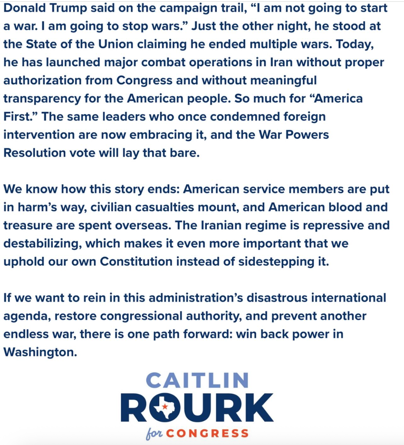 Caitlin Rourke, see statement she made about the Iran bombing HERE. Members of the US House of Representatives are up for election every two years. Many will be on the November 2026 ballot.