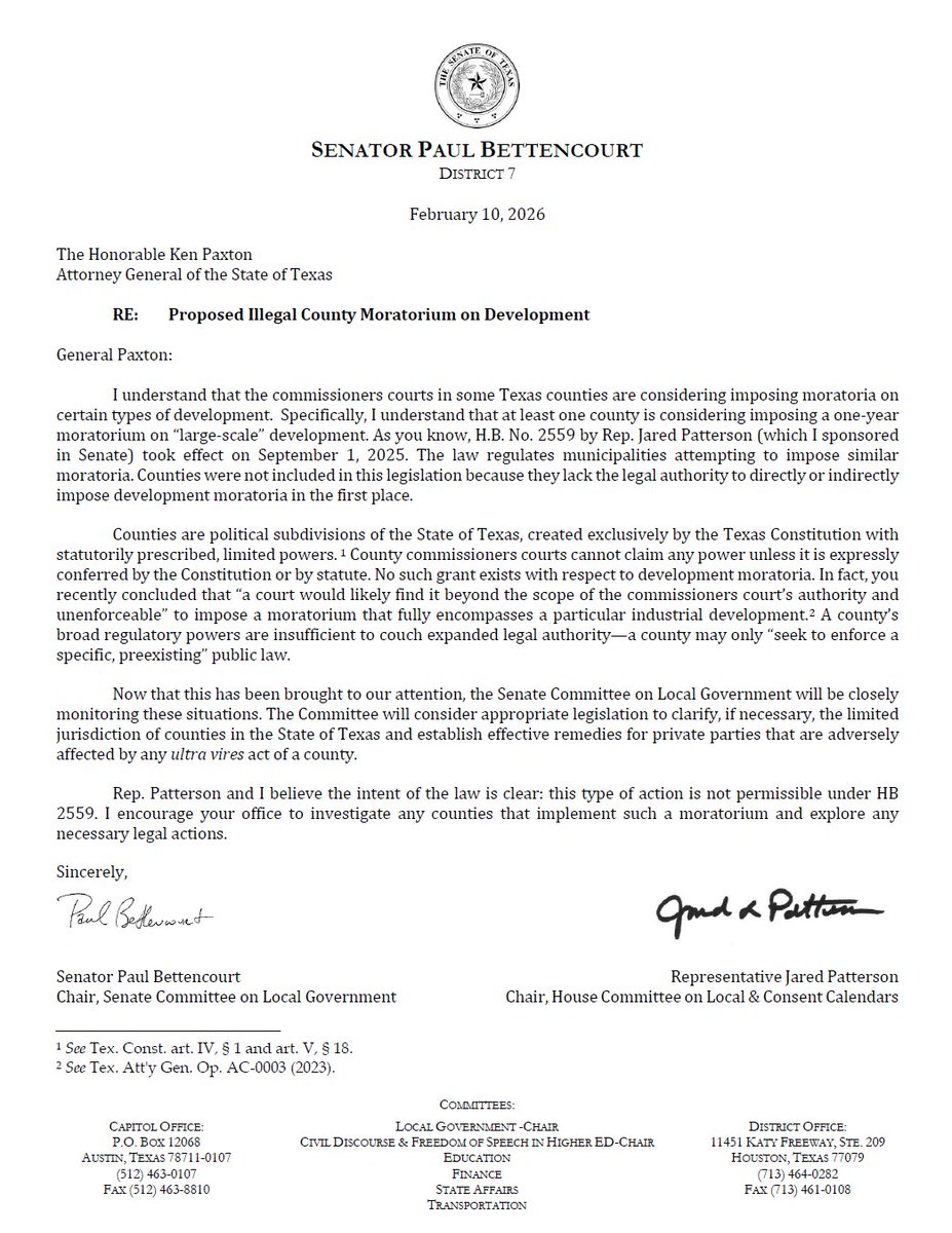 We are not aware, and apparently neither was Bettencourt, of any Texas Attorney General Opinion concerning county moratoria on data centers, but he did not mind conflating a 2023 AG opinion on a solar project with different facts. Instead, he primarily relied upon the 2025 passage of SB 2559, that he said addressed the regulation of municipalities (that is, not counties) attempting to “impose similar moratoria." Ok, maybe we're serious that Bettencourt is practicing law, just badly.